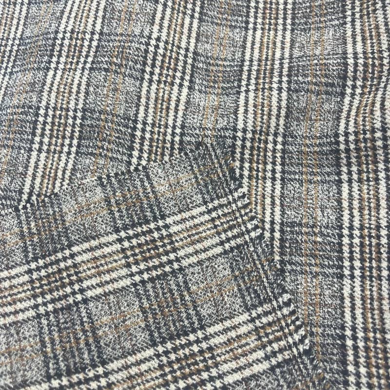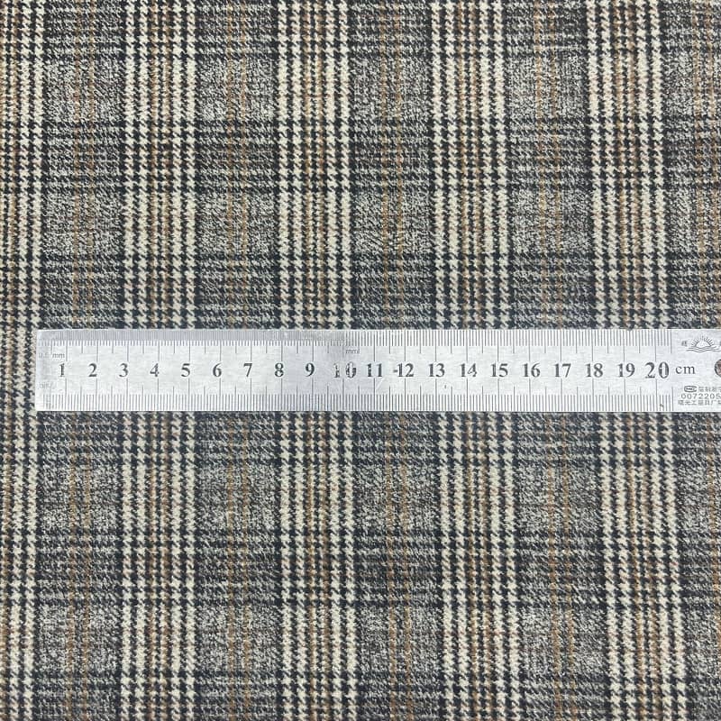 Tämä kangas, jota kutsutaan artikkeliksi 250515, on kudottu tekstiili, joka koostuu 20 % villasta, 75 % polyesterista ja 5 % elastaanista. Sen massa pinta-alayksikköä kohti on 450 g/m, joten se on keskipainoinen, pukeutumiseen sopiva rakenne. Kankaassa on integroitu ruudullinen ja ruskea koiranhammaskuvio, jossa on metallisia lankaelementtejä visuaalista kontrastia varten. Elastaanin sisällyttäminen tarjoaa noin 20-25 % vaakasuoran venytyskapasiteetin, kun taas villan ja polyesterin sekoitus säilyttää rakenteellisen vakauden. Tämä kuitukoostumuksen ja kudontatekniikan yhdistelmä luo kankaan, jolla on määrätty joustavuus ja kuviointi, joten se soveltuu nykyaikaisiin räätälöityihin vaatteisiin, jotka vaativat sekä liikkuvuutta että esteettisiä yksityiskohtia.