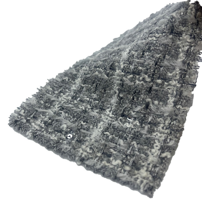Tämä kangas, jota kutsutaan artikkeliksi 23503, on tweed-tekstiili, joka koostuu 49 % akryylistä, 40 % polyesterista, 7 % villasta ja 4 % nailonista. Sen massa pinta-alayksikköä kohti on 335 gsm, joten se on kevyt mutta rakenteeltaan rakenteeltaan. Pinnalla on hieno harmaa ruudullinen kuvio, joka saadaan kohokuviointiprosessilla, joka luo kankaaseen hienovaraisen kohotetun tekstuurin. Tämä tekniikka parantaa ruudun visuaalista syvyyttä muuttamatta kudottua pohjaa. Monikuitusekoitteessa yhdistyvät polyesterin vakaus, akryylin kimmoisuus, villan luonnollinen kosketus ja nailonin kestävyys. Nämä ominaisuudet tekevät kankaasta sopivan naisten vaatteisiin, joissa vaaditaan yksityiskohtaista kuviointia ja tuntoon liittyvää kiinnostusta.