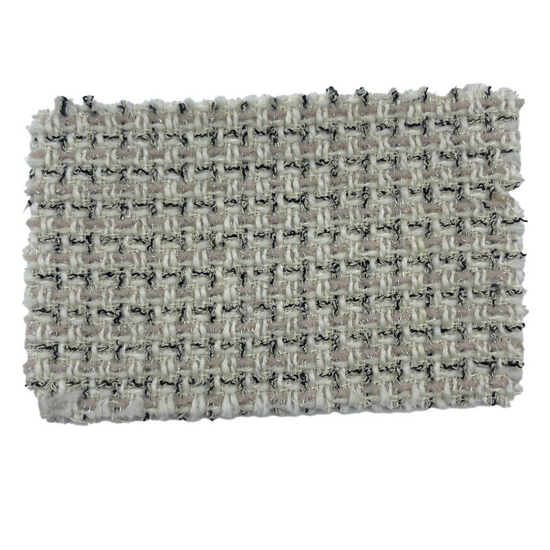 Tämä artikkeliksi 23523 merkitty kangas on tweed-tekstiiliä, joka koostuu 78 % polyesterista, 12 % villasta ja 10 % puuvillasta. Sen massa pinta-alayksikköä kohti on 440 gsm, joten se on mekoihin sopiva keskipainoinen rakenne. Vaaleanpunaisessa pohjassa on ruutukuvio, joka on integroitu metallilangalla kudontaprosessin aikana. Tämä yhdistelmä luo kontrastin sekä visuaalisessa ulkonäössä että valon heijastuksessa. Polyesterin, villan ja puuvillan sekoitus edistää kankaan mittapysyvyyttä, lämmönsäätöä ja kosteudenhallintaa. Nämä tekniset ominaisuudet tekevät tästä tweedistä soveltuvan muotimekkoihin, joissa vaaditaan kuvion määrittelyä ja materiaalin suorituskykyä.