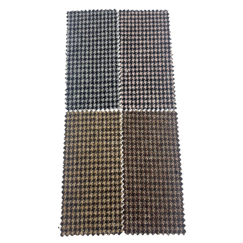 Tämä artikkeliksi 4334 merkitty kangas on kudottu tweed-tekstiili, joka koostuu 35 % villasta ja 65 % muista kuiduista. Sen massa pinta-alayksikköä kohti on 450 g/m, joten se on keskipainoinen rakenne. Pinnalla yhdistyy koiranhammaskuvio ja ruutuelementit, mikä luo yhdistelmägeometrisen kuvion tarkkojen kudontatekniikoiden avulla. Tämä rakennusmenetelmä tuottaa toisiinsa lukittuvia rikkinäisiä ruutuja, joissa on määritelty värikontrasti kankaalle. Villasekoituskoostumus edistää kankaan mittapysyvyyttä ja ryppynkestävyyttä. Nämä tekniset ominaisuudet johtavat materiaaliin, jossa on monimutkainen kuviointi ja rakenteellinen kestävyys, joten se soveltuu housuihin, joissa vaaditaan yksityiskohtaista kuviointia ja pitkäkestoista suorituskykyä.